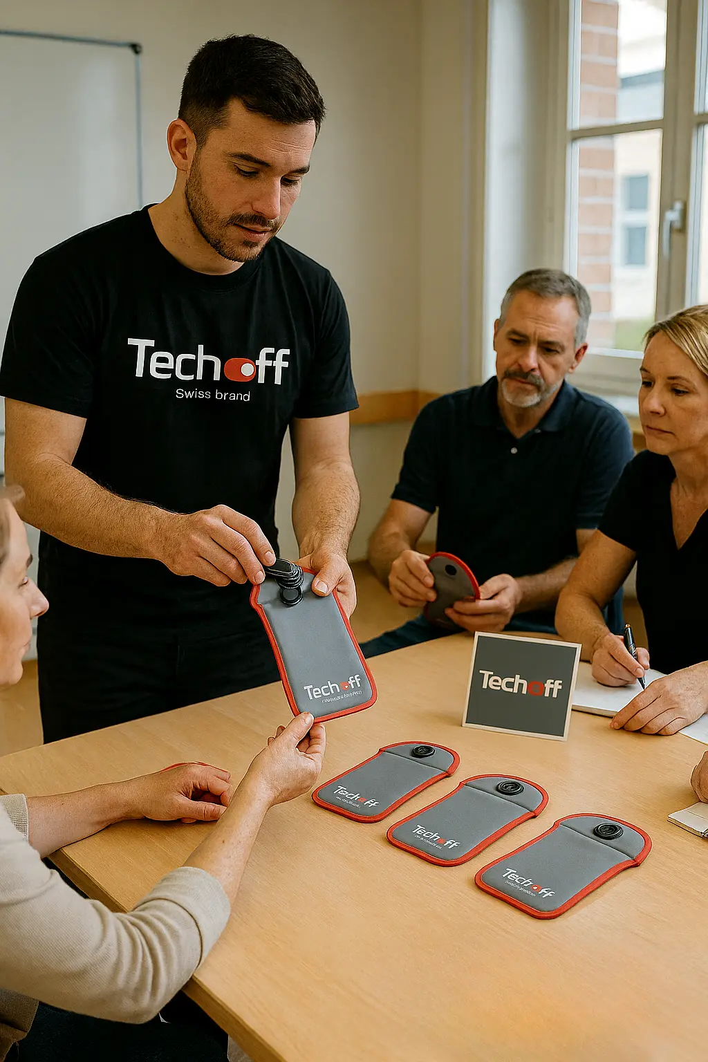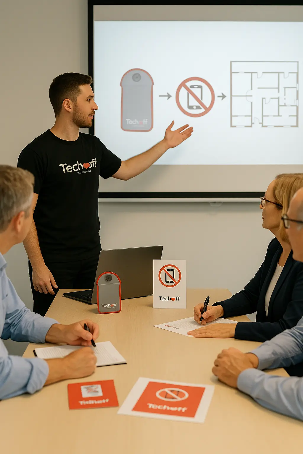Nous vous assistons dans l’installation, la formation de vos équipes et le suivi continu. Grâce à Tech Off, vos écoles, tribunaux ou institutions bénéficient d’une solution clé en main avec nos pochettes verrouillables bloquant le signal des smartphones.